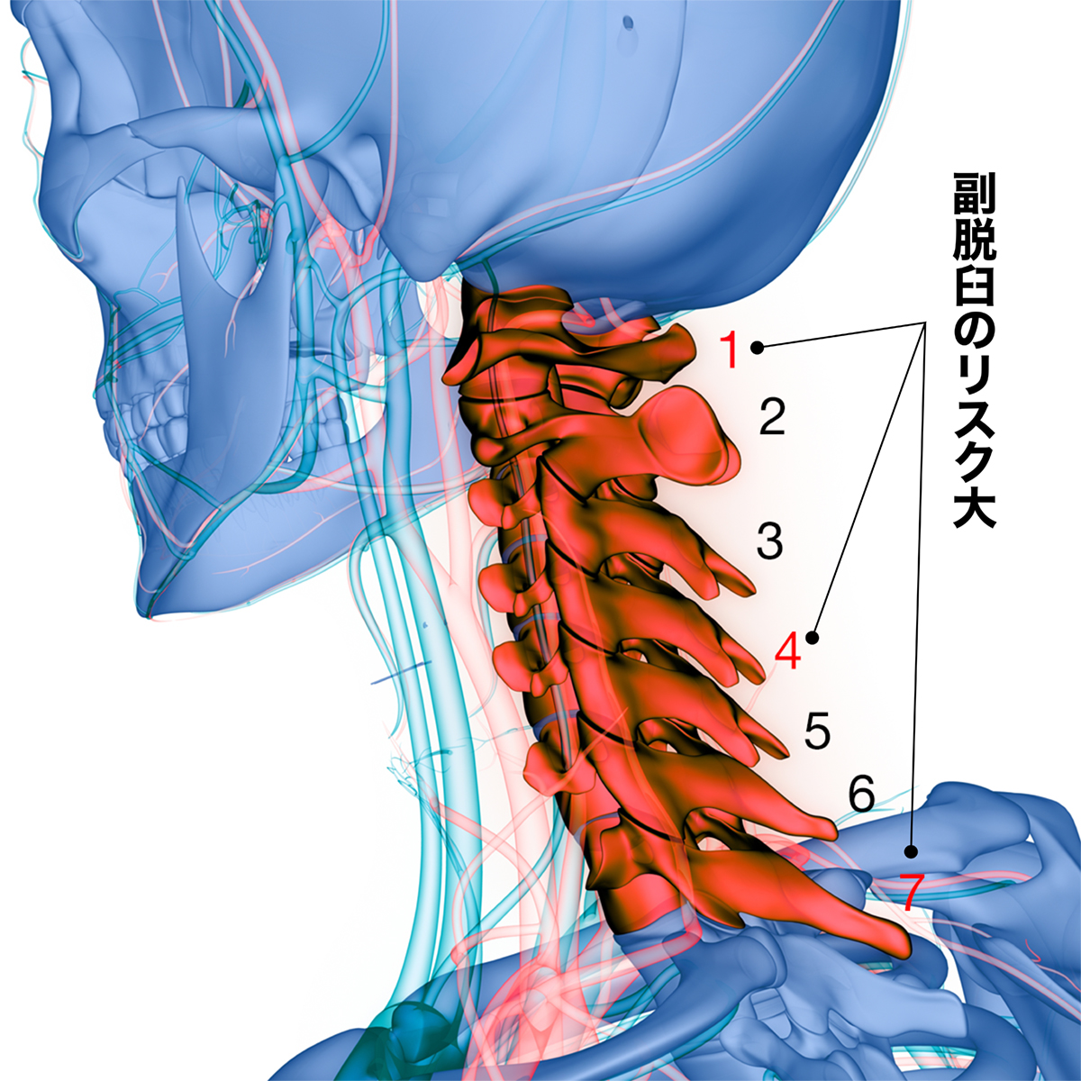 特に7つある頚椎のうち、頭部にある「1番」、「中央の4番」、「一番下の7番」の頚椎は「副脱臼」を起こしやすく、圧迫された骨と骨の間を伸ばしてやることが必要になります。(上図を参照)