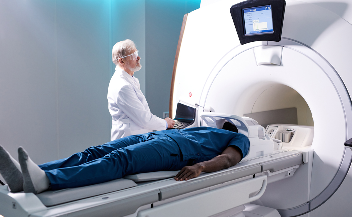 Senior Radiologist Controls MRI or CT or PET Scan with Male Patient Undergoing Procedure. High-Tech Modern Medical Equipment.