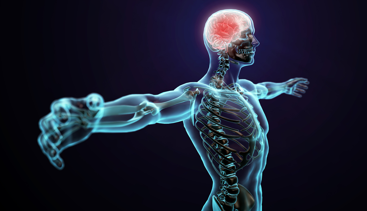 Human anatomy illustration – central nervous system with a visible brain