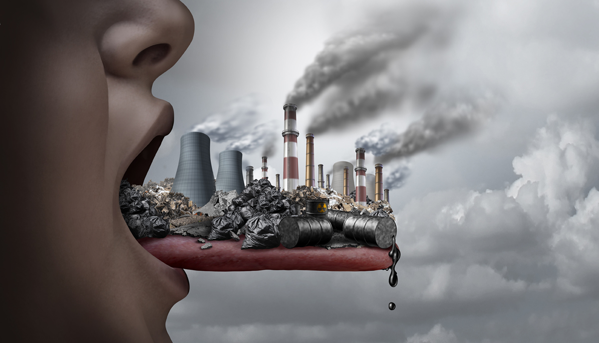 Toxic pollutants inside the human body and eating pollutants as an open mouth ingesting industrial toxins with 3D illustration elements.