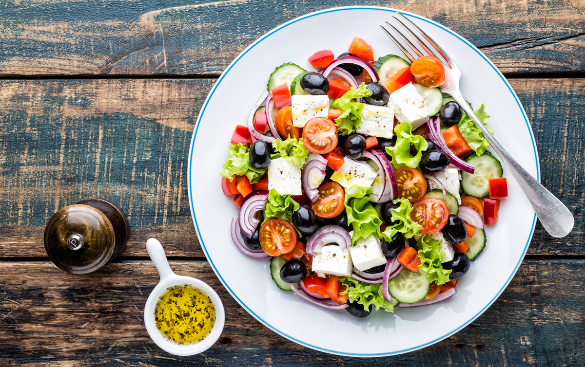 Greek salad of fresh cucumber, tomato, sweet pepper, lettuce, red onion, feta cheese and olives with olive oil.