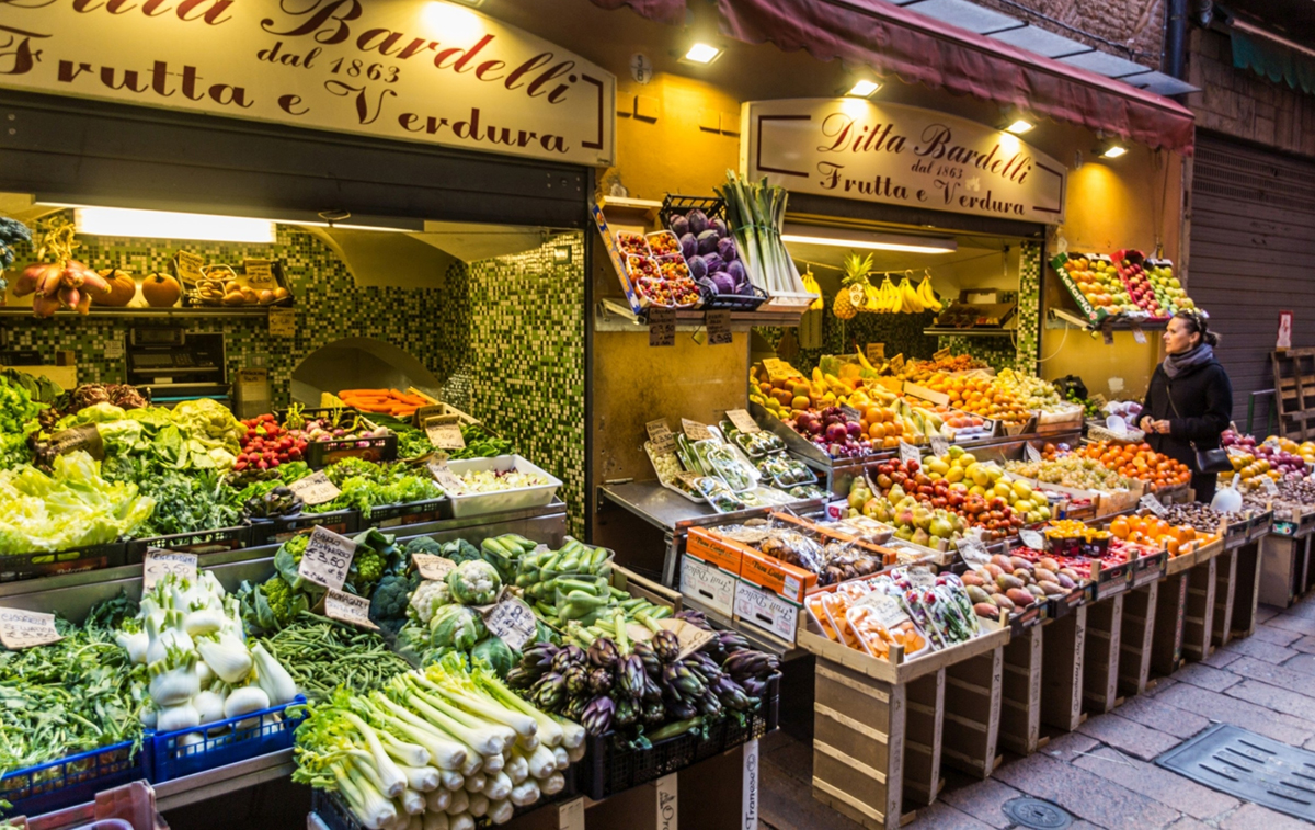 BOLOGNA, ITALY – OCTOBER 22, 2018: Fruit and vegetable stall in the center of Bologna, Italy