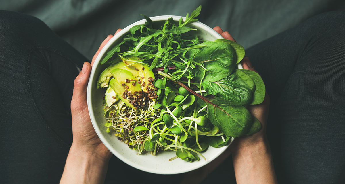 Green vegan breakfast meal in bowl with spinach, arugula, avocado, seeds and sprouts.