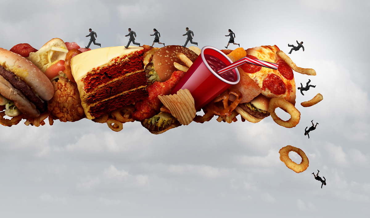 Junk food health risk nutrition concept as a group of people running and falling on a pile of high sugar sodium and cholesterol fat snacks as a diet metaphor with 3D illustration elements.