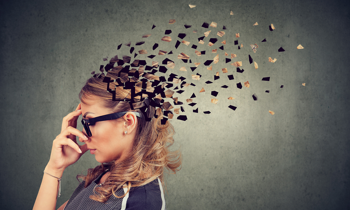 Memory loss due to dementia or brain damage. Side profile of a woman losing parts of head as symbol of decreased mind function.