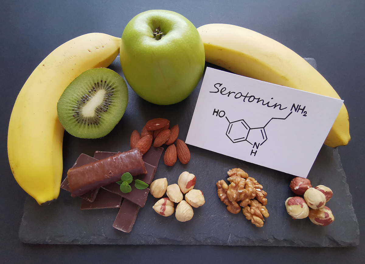 Serotonin-boosting foods. Assortment of food for good mood and happiness. Healthful foods that may help boost serotonin. Natural sources of serotonin with structural chemical formula of serotonin.