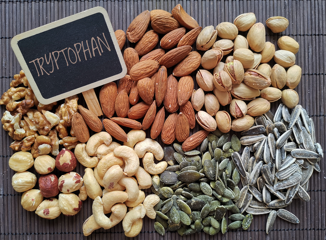 Foods rich in tryptophan. Natural sources of tryptophan: almond, hazelnut, walnut, pistachio, cashew, sunflower and pumpkin seeds. Foods for getting good sleep or relaxation. Various seeds and nuts.