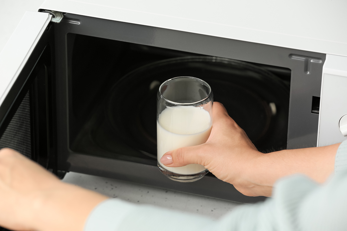 Young woman putting glass with milk into microwave oven, closeup