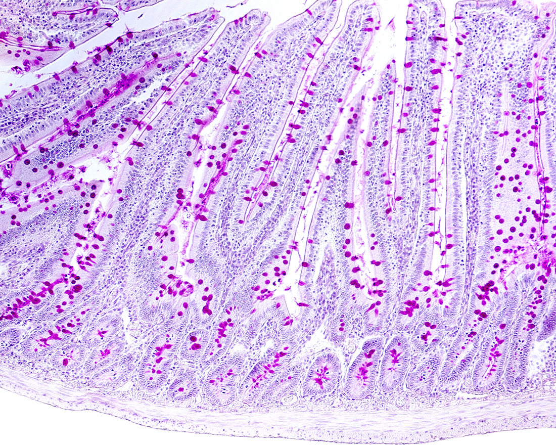 Wall of the small intestine stained with PAS technique. Goblet cells apper as fuchsia points in the epithelium lining the villi and the crypts of Lieberkhün.