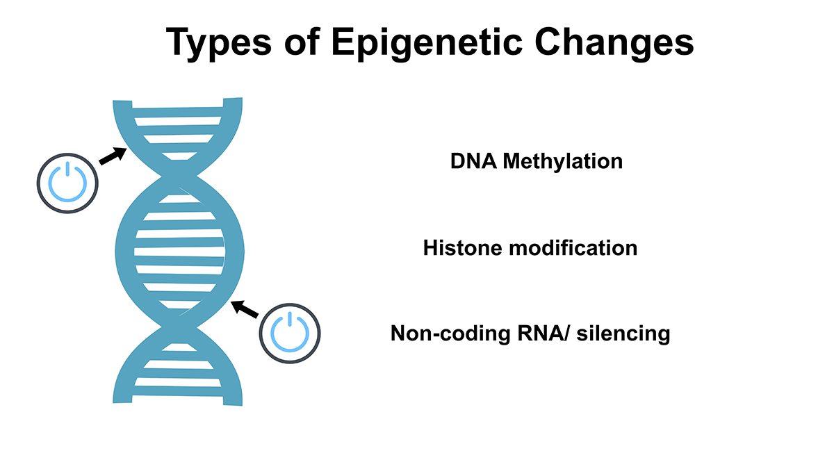 Epigenetics presentation slide illustration stating 3 types of epigenetic changes: DNA methylation, histone modification, non-coding RNA, or RNA silencing