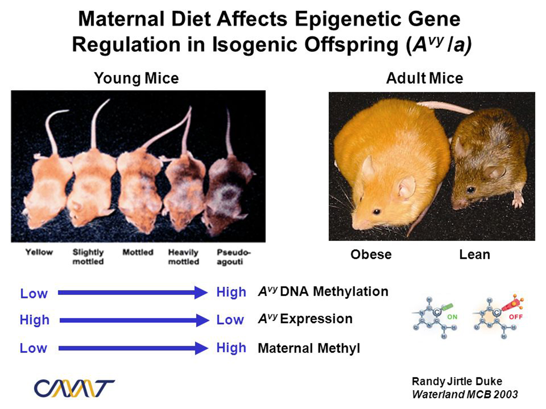 6.Waterland R, Jirtle RL. “Transposable Elements: Targets for Early Nutritional Effects on Epigenetic Gene Regulation.” Mol. Cell. Biol. 2003;23(15):5293-5300; Dolinoy DC, Wied- man J, Waterland R, Jirtle RL. “Maternal Genistein Alters Coat Color and Protects Avy Mouse Offspring from Obesity by Modifying the Fetal Epigenome.” Environ Health Perspect. 2006;114(4):567-72.