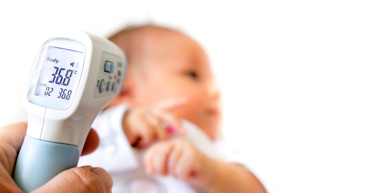 Measure baby’s fever with digital fever meter. sick baby with high fever