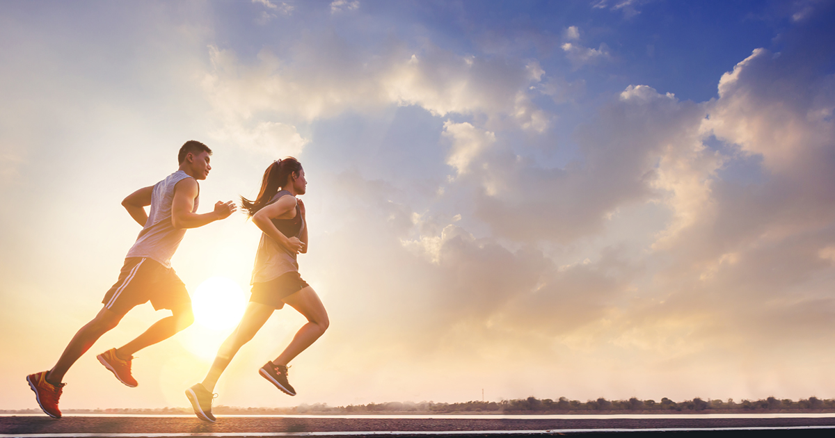 Young couples running sprinting on road. Fit runner fitness runner during outdoor workout with sunset background