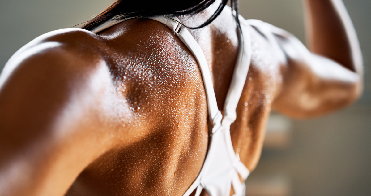 Close up of woman back with flexing her muscles in sweat on skin after workout. Female bodybuilder with perfect biceps