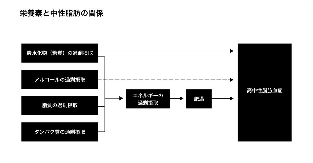 炭水化物(糖質)やアルコールは、直接的に中性脂肪を上げますが、炭水化物やアルコール、脂質、タンパク質はエネルギー(カロリー)源になりますから、どれでも必要以上に食べれば、肥満を介して中性脂肪を上げることになります。