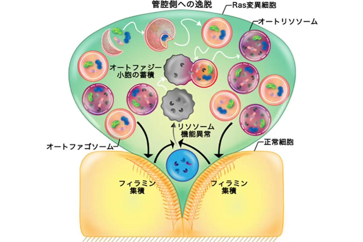 細胞競合におけるオートファジーの役割。正常細胞のフィラミン集積が変異細胞内のリソソーム機能低下ならびに、オートファジー小胞の蓄積を誘引し、さらに蓄積したオートファジー小胞が正常細胞のフィラミン集積を促す(出典:理科大Webサイト)