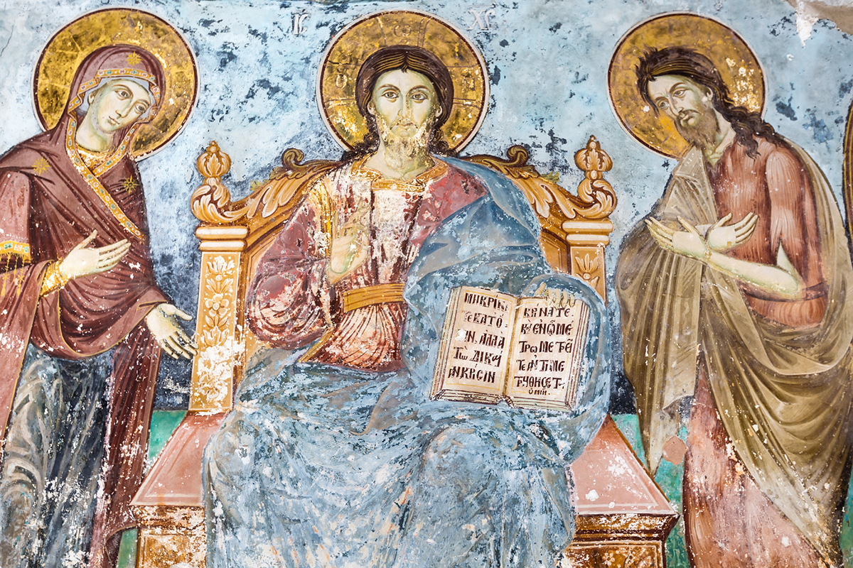 Mount Athos, Greece – May 28, 2016: Timeworn frescoes of saints on the outer side of the Church of Protaton in karyes, Mount Athos