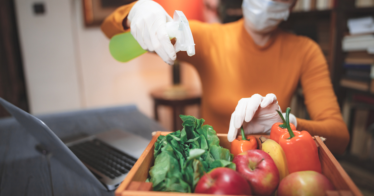 Woman with protective medical mask spraying sterilizing chemical on the food ordered from internet delivery.
