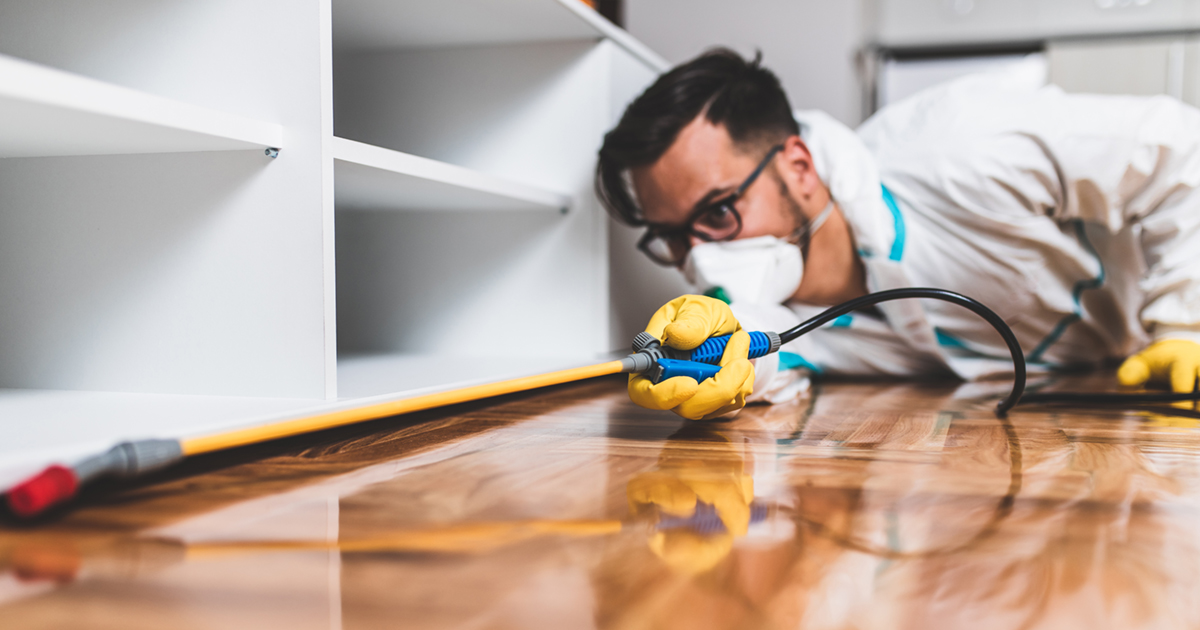 Exterminator in work wear spraying pesticide with sprayer. Selective focus.