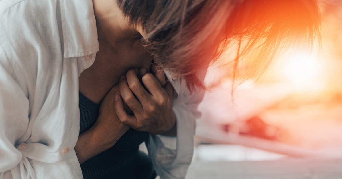 Woman’s hand on chest with red spot as suffering on chest pain. Female suffer from heart attack,Lung Problems,Myocarditis, heart burn,Pneumonia or lung abscess, pulmonary embolism day