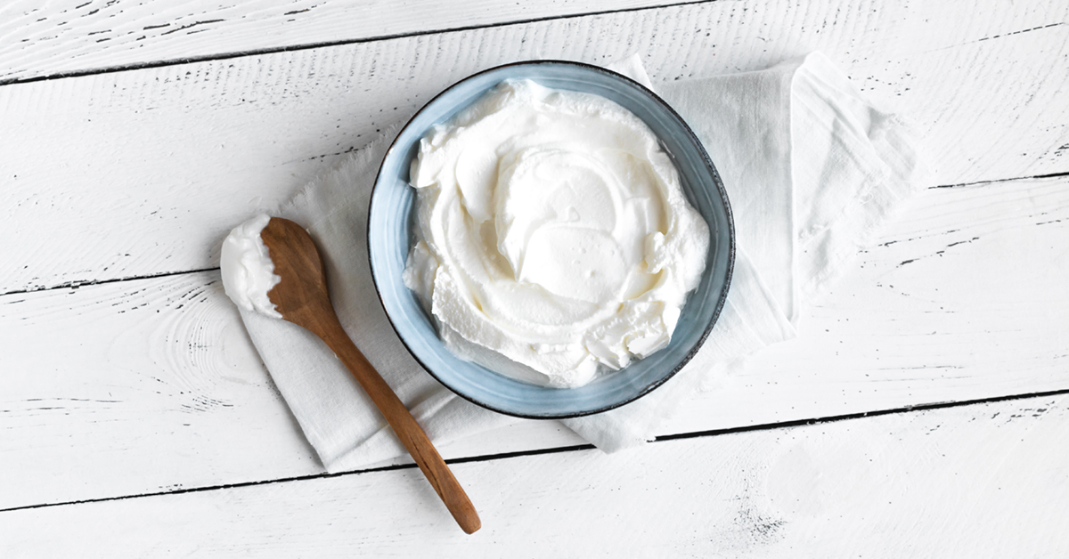 Natural Greek Yogurt in ceramic bowl on white wooden background, top view, copy space. Fresh homemade organic plain yogurt or sour cream.