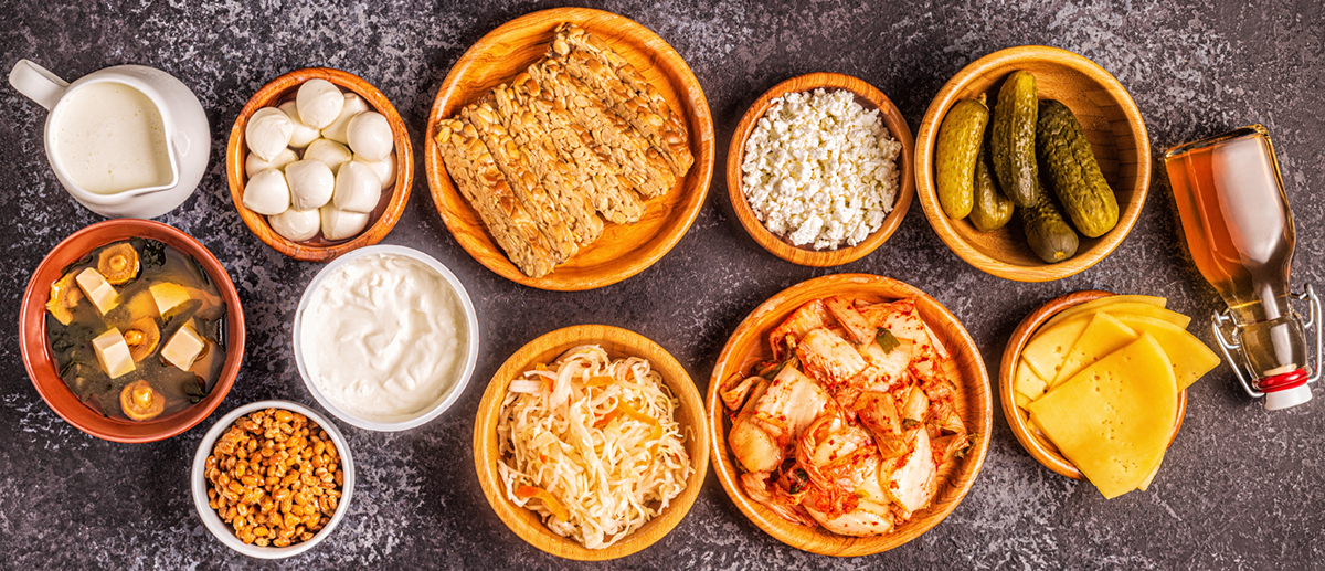 Fermented food, probiotics – kefir, kombucha, sauerkraut, pickles, miso soup, tempeh, natto, kimchi, yogurt, mozzarella and gouda cheeses, cottage cheese.