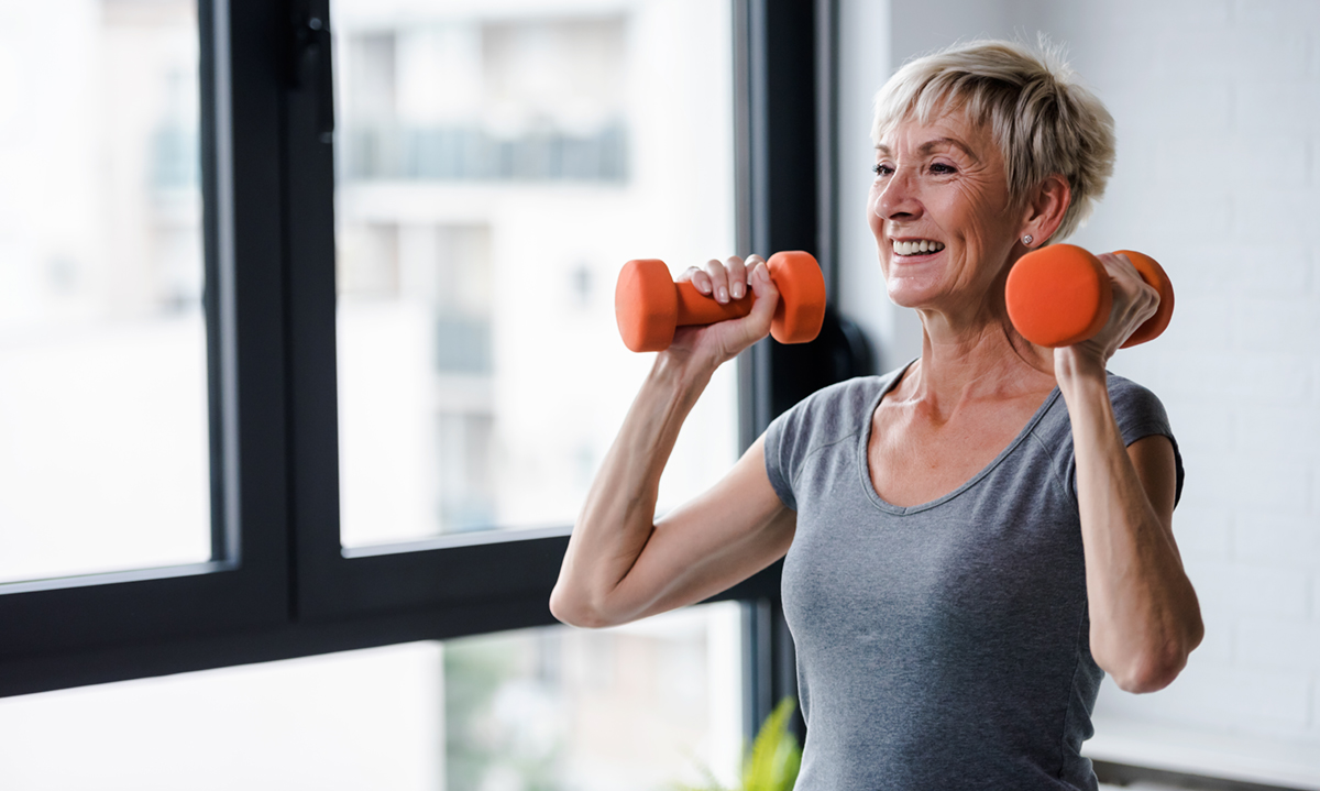 Portrait of senior woman lifting dumbbells