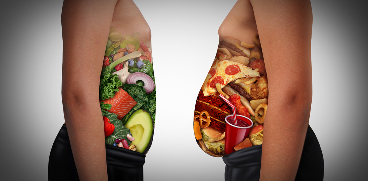 Child nutrition choice eating unhealthy diet or healthy food as a side view of a fat and normal kid with the stomach made from junk food or health ingredients with 3D illustration elements.