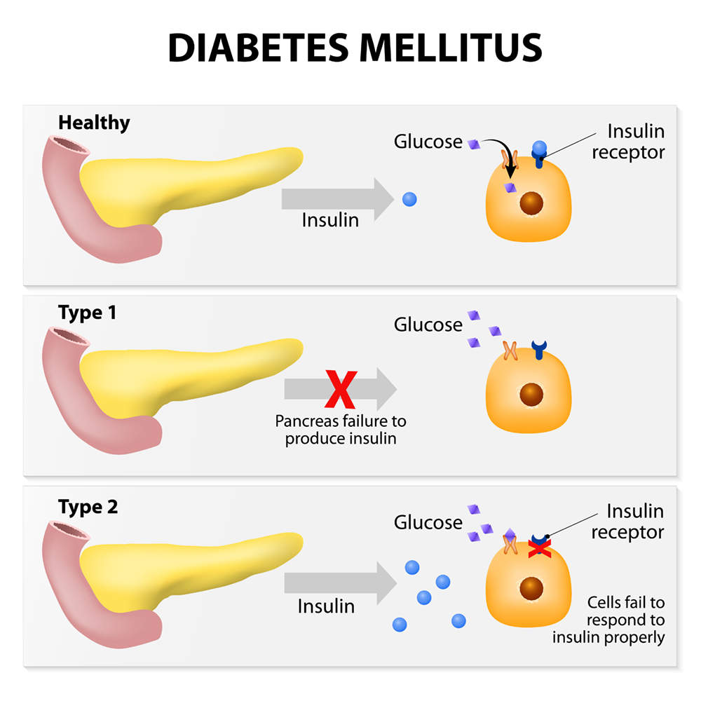 Main types of diabetes mellitus. Either the pancreas not producing enough insulin or the cells of the body not responding properly to the insulin produced