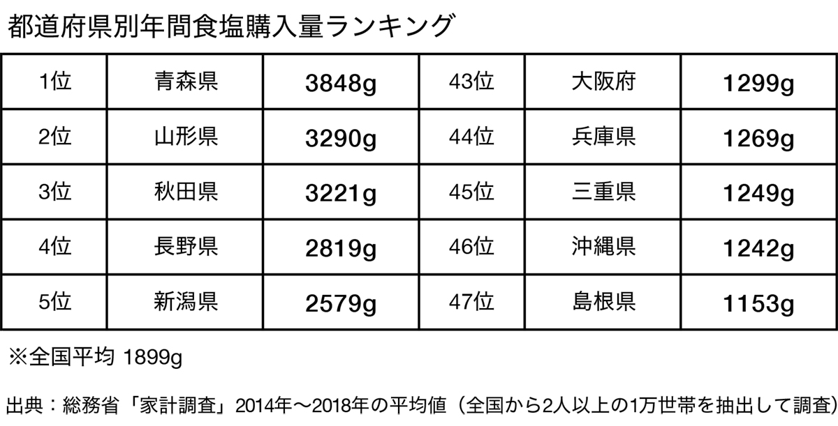1960年頃、1日13〜14gの食塩摂取をしていた鹿児島など南日本の人々の高血圧の発症率が約20%、同じく27〜28gと2倍もの食塩摂取をしていた秋田、青森などの東北地方の人々の発症率が約40%という結果が出たため、「塩分こそ、高血圧や脳出血の元凶である」という結論になったというわけです。