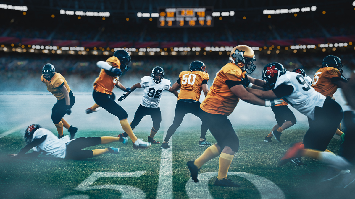 American Football Field. Two teams with Professional Players, Fight for Ball and Score, Aggressive Face-off, Tackle, Pass. Warrior Competition Full of Brutal Energy, Power, Skill.