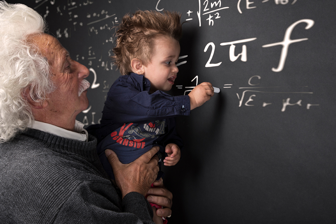 Grandfather scientist with grandchild in arm writing at the blackboard