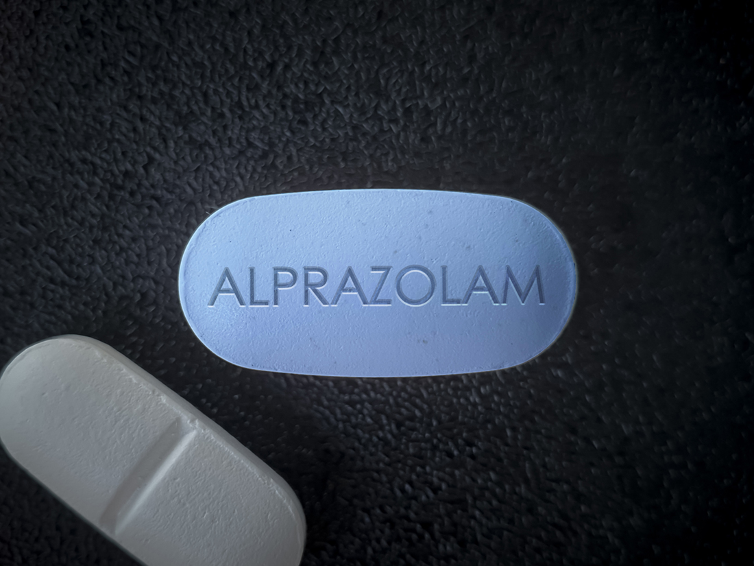 Alprazolam blue pill short acting tranquilizer of the benzodiazepine class used to treat anxiety disorders, panic disorder and chemotherapy induced nausea