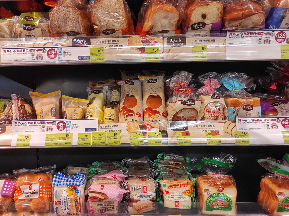 Hong Kong, August 18, 2023 : Display rack of bread of various brands and flavors for sale in a supermarket