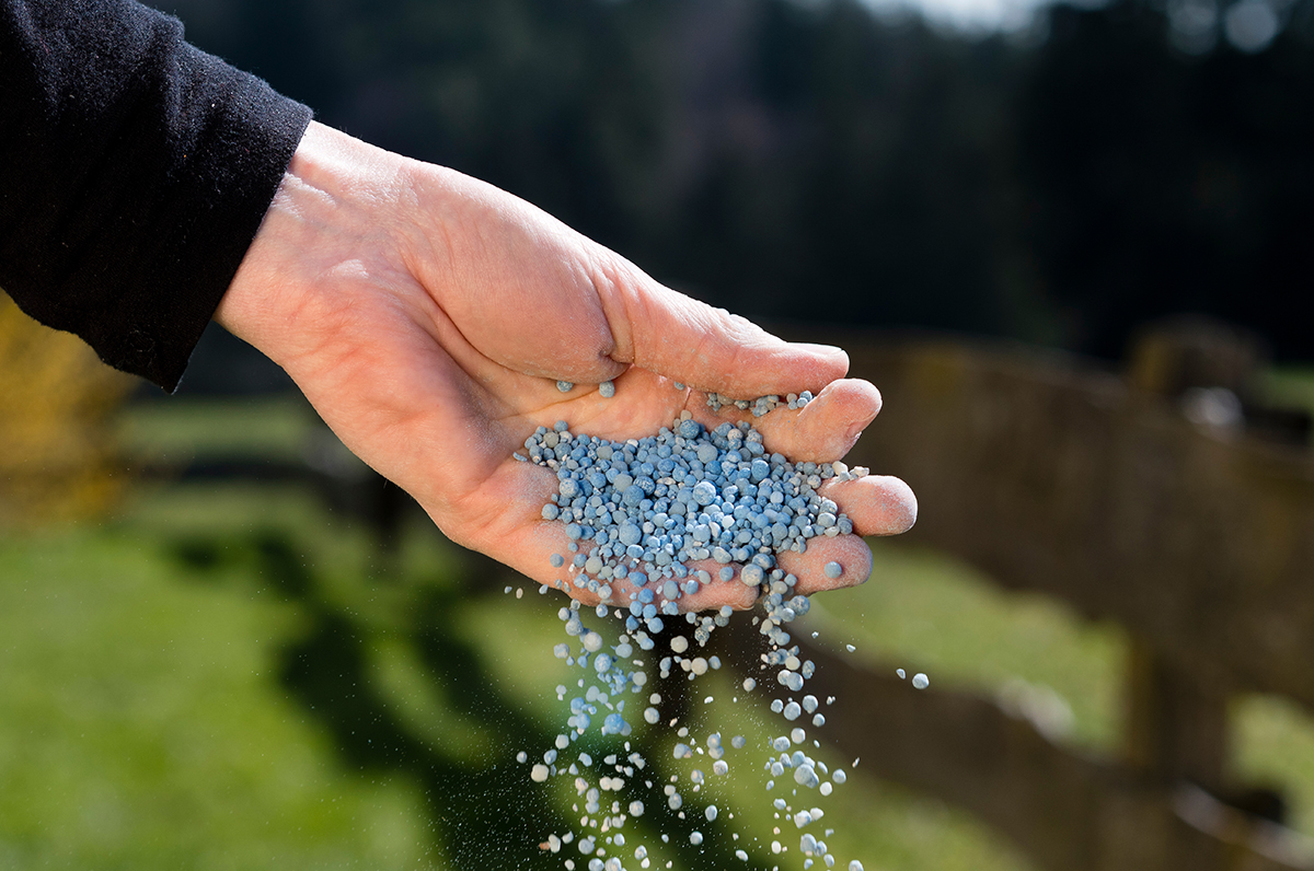 how to apply chemical fertilizer to plants in garden; hand holding and spreading chemical fertilizer or blue corn / blue fertilizer – how to fertilize your garden by hand using chemical fertilizer