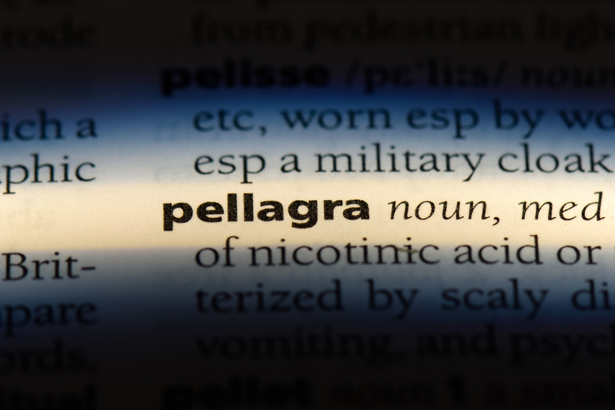※ペラグラ:ビタミンB群の一種であるビタミンB3(ナイアシン、またはニコチン酸アミド)の欠乏により発症する疾患です。炭水化物・脂質・タンパク質・アルコールの代謝に異常をきたし、光線過敏症などの皮膚症状が現れます。先進国では稀な病気ですが、重度のアルコール依存症、摂食障害、吸収不良症候群の患者や、抗結核薬や抗がん剤を投与されている患者に見られることがあります。放置すると死に至ることもあります。