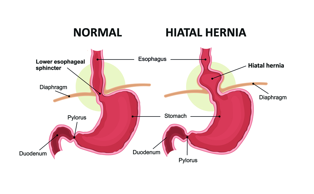食道裂孔(しょくどうれっこう)ヘルニア(hiatal hernia)は、胃の一部が横隔膜を通り抜けて胸腔側に入り込む状態を指し、胃食道逆流症(GERD: Gastroesophageal Reflux Disease)の重要な原因の一つとされています。