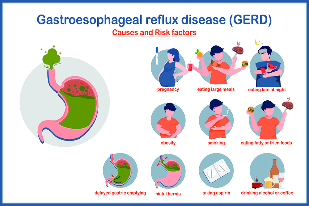 Illustration showing Gastrophageal reflux disease (GERD) is a digestive disorder where stomach acid flows back into the esophagus, causing discomfort and complications.