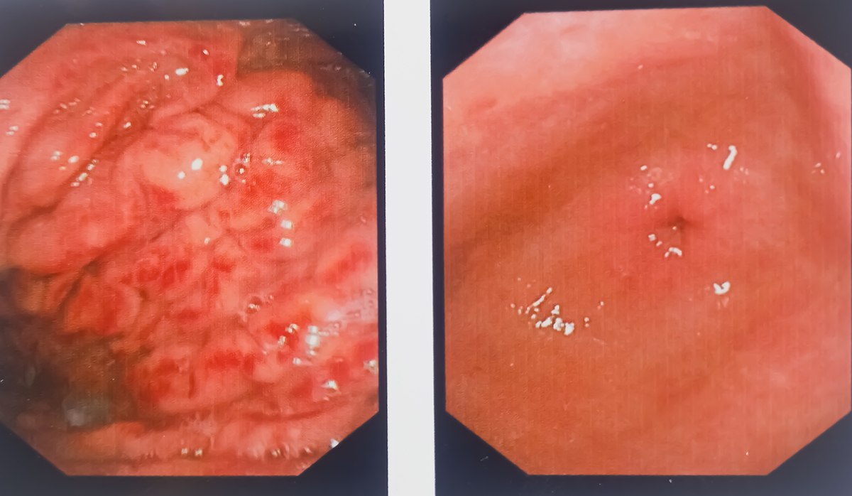Hiatus hernia with severe gastritis. Gastrointestinal endoscopy, medical imaging EGD looking for structures in the esophagus.