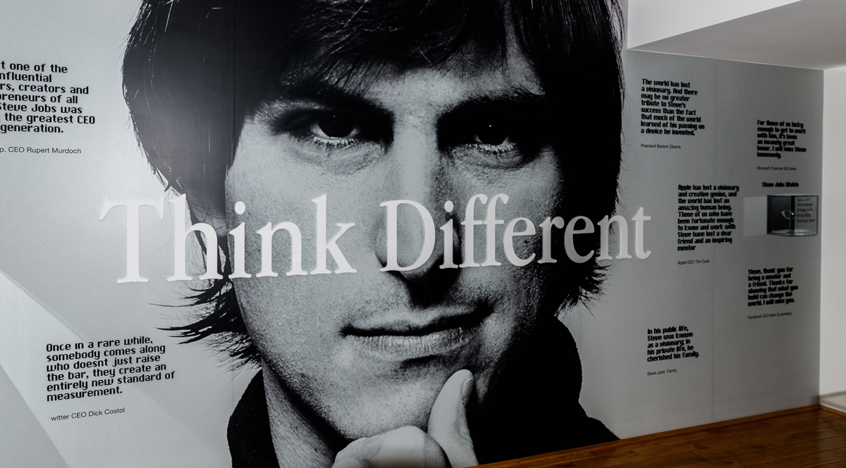 PRAGUE, CZECH REPUBLIC – AUG 6, 2017: Think Different slogan and young Steve Jobs photo, Apple museum in Prague.