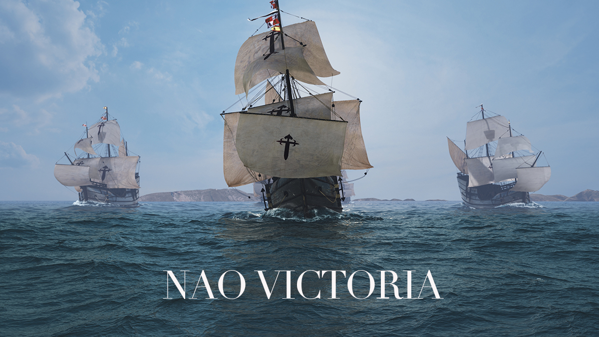 The NAO VICTORIA in front is the flagship of MAGELLAN .A scientific 3D-ILLUSTRATION of Magellan’s Armada. In 1519 starting an expedition to circumnavigate the world