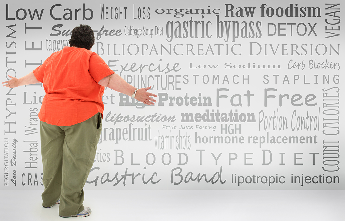 Overwhelmed obese woman looking at list of fad diets and surgical weight loss methods written on wall.